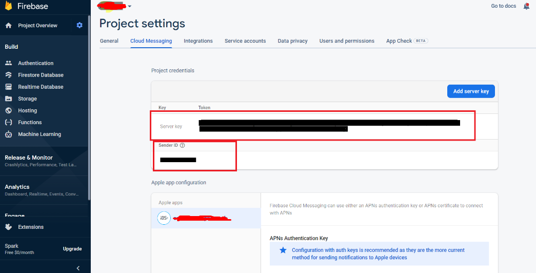 - After get Firebase Server key and Sender ID. Goto the firebase app and in left