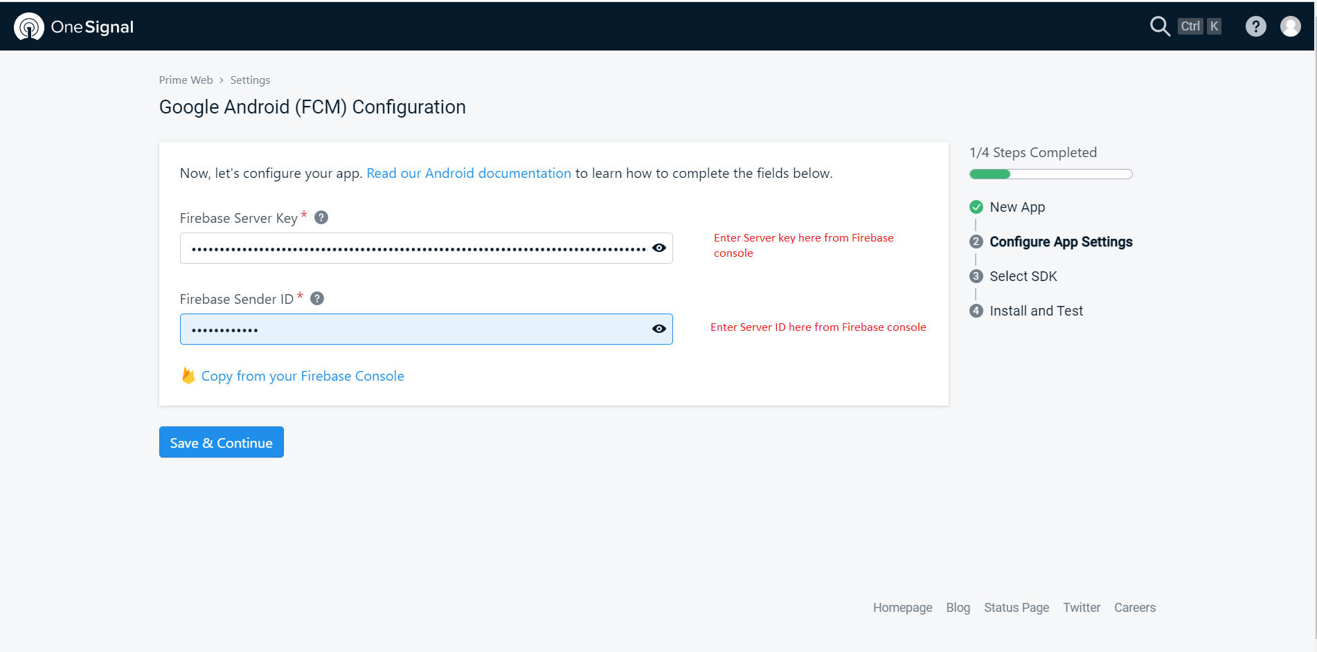 Step 2: Go to your Firebase Console-> Project Settings -> Cloud Messgaing and copy 'Server Key' and 'Server ID'